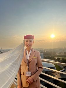 私は2022年10月にエミレーツ航空の客室乗務員に応募しました。最終面接を終えた数日後にエミレーツ航空から「今週末にドバイに引っ越してきてください。」という電話がかかってきました。授業や卒業論文の執筆があったため、1か月ほど入社時期を伸ばしていただき、1月の半ばにドバイに引っ越しました。そこから2か月間ほどトレーニング期間を経て、客室乗務員になりました。トレーニング期間が卒業式の2日前に終了したため、ぎりぎり卒業式に出席することができました。