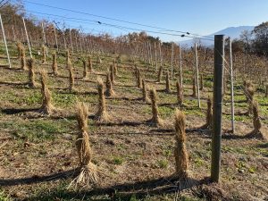ワイナリー「Terre de ciel」の見学では、経営者の池田さんが、定年退職後に自らワイン葡萄を栽培し、その葡萄でワイン醸造をはじめた経緯、苦労、こだわりなど貴重なお話を伺った。池田さんの圃場は、ワイン葡萄の栽培には不利といわれる高い標高にあるが、凍害防止の作業をしっかりと施せば、日射量抜群と強風の風土を活かしたワイン葡萄栽培をすることができる。市場には外国産の安価でおいしいワインが多い中で、“自然派ワイン”という強いこだわりを付加価値として生み出し、「少し高額でもおいしいワインを飲んでほしい」というモットーで葡萄栽培、ワイン醸造に非常にこだわっていた。取引先は、ホテルやレストラン、県外からの観光客が主であったが、コロナ禍でSNSや通販に転換した。ふるさと納税の返礼品にもなっており、ワイン部門のなかでは全国的にも上位に入るほどの人気であるという。