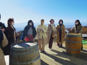 続いて、標高約1000メートルのところでブドウ農家と共に営むワイナリーを訪問した。絶景を望むそのワイナリーでは、生産者である池田さんのワインづくりに関する紆余曲折を伺った。定年退職後の夢を追った点など詳しく聞くことができ、農業的観点からの学習のほか、自分のキャリア設計の観点からでも有意義な時間となった。