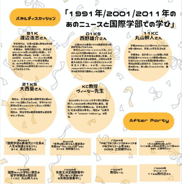 ・パネルディスカッション (国際学部設立以来の西暦末尾1の年に起こった出来事、1991年 湾岸戦争、2001年 アメリカ同時多発テロ、2011年 東日本大震災、2021年 コロナウイルス蔓延などについて国際学部の先生方が解説。該当入学年の卒業生・在学生数名がディスカッション)