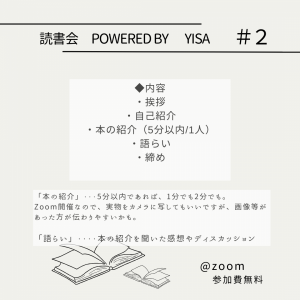 ※「本の紹介」について・・・5分以内であれば、1分でも2分でも問題ありません。Zoomでの開催ですので、実物をカメラに映していただいてもいいですが、画像等があった方が伝わりやすいかもしれません。