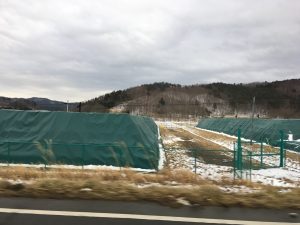 飯舘村内には、除染したものの行き場のない数多くのフレコンバックが未だに残っており、異様な光景だった。