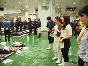 各水産物を仕分けるスペースの見学後はマグロのセリを見学した。間近で見るマグロのセリは思っていた以上に迫力があり、圧倒された。セリにかけられるマグロは冷凍マグロ、本マグロ、養殖マグロがあり、やはり本マグロが一番セリにかけられ高価な値段がつけられる。また、マグロの漁獲方法の違いによって値段の増減が生じることが分かった。