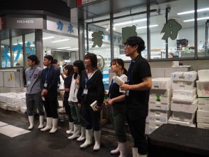 重冨ゼミでは農業経済について学んでいるため、農作物流通については学んでいたが水産物流通については学んでいなかった。そのため、流通の面で共通している水産物流通についても学ぶ必要があるということで日本の水産物流通の大半を占める豊洲市場に足を運び、マグロのせりや、施設内環境、荷受会社である中央魚類の担当の方へのインタビューを行うことで水産物流通についての知識を得るという取り組み。