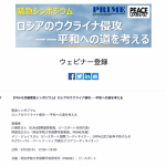 2022年3月1日 / 最終更新日時 : 2022年3月1日 yisa 最新のお知らせ 3/3(木)【PRIME共催緊急シンポジウム】ロシアのウクライナ侵攻——平和への道を考える さる2月24日、ロシアがウクライナ全土に対して軍事侵攻を開始し、国連のグテーレス事務総長は、現在の事態を「世界の平和と安全にとって、ここ数年で最大の危機」と形容しています。日頃ニュースをチェックしていなか […]